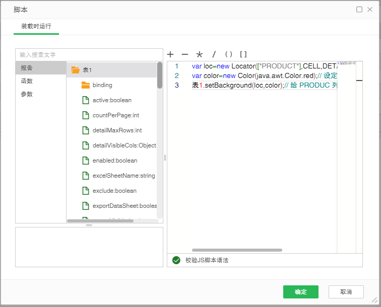 2. 打开表组件的脚本,打开脚本输入对话框,输入脚本: