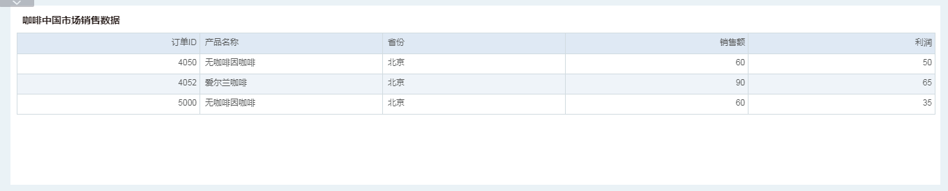 6. 进入制作报告,打开报告“北京/报表1”,创建表1,绑定数据集“咖啡中国市场销售数据”上的“省份”等列,如下图所示: