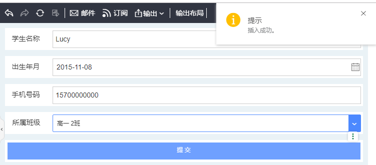 保存上文报表后,在【查看报告】中打开报表,录入数据:Lucy、2015-11-08、15700000000 、高一 1班 后点击提交: