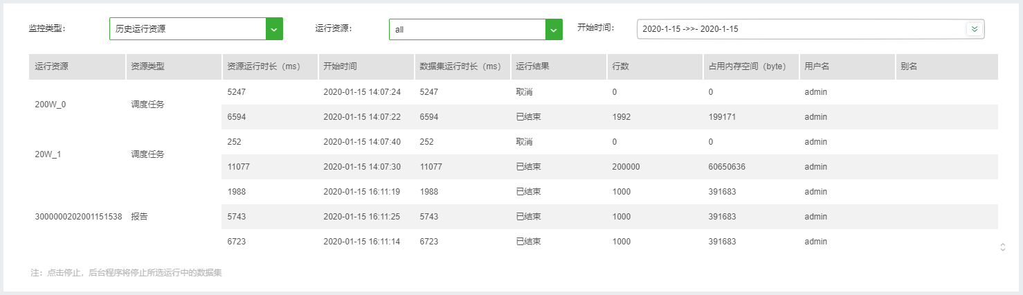 “ 运行资源信息监控统计 ” 用于对系统内正在运行和运行完成的 “ 数据集 ”、“ 仪表盘 ”、“ 调度任务 ” 的情况进行监控。可以通过选择监控类型查看当前运行状态、历史运行记录。