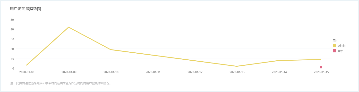 在 “ 用户登录信息监控 ” 中,可通过选择开始和结束时间来查询指定时间内的用户登录详细情况。默认时间为最近七天,并且以趋势图的形式直观展示。