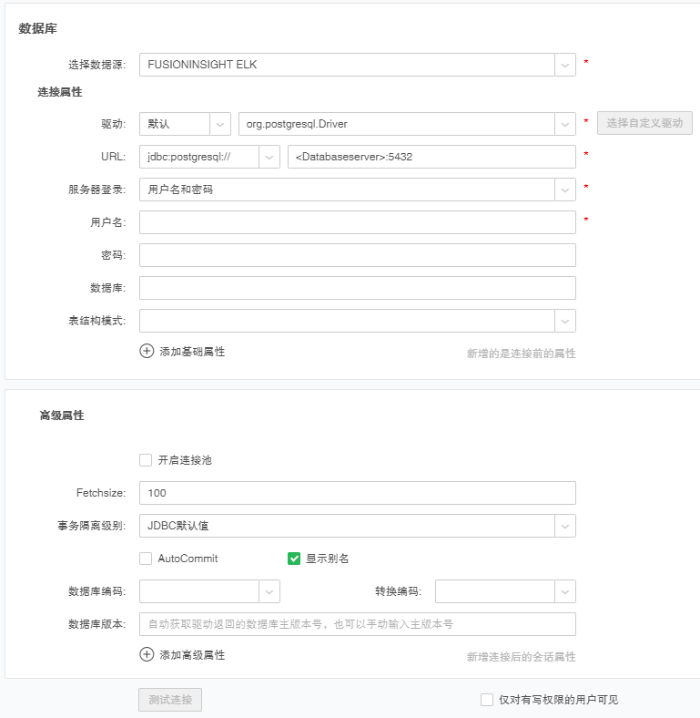 2.填写相应的 FUSIONINSIGHT ELK 数据库连接信息,至少把必填项都填写完毕。
