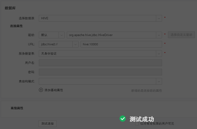 2.填写相应的 HIVE 数据库连接信息,至少把必填项都填写完毕。。