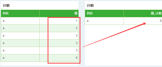 例如,给表格组件绑定2列“列名”和“值”,列“列名”的聚合方式为计数,如下图所示,“a”对应的所有值的数据总行数计数为6。