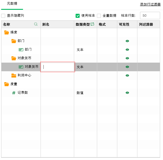 元数据中选中某列,点击别名,可以为该列设置别名。
