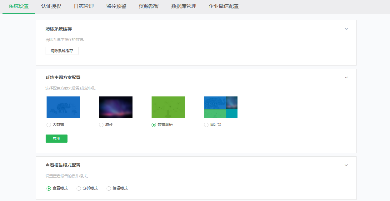 系统设置界面的主要功能包括清除系统缓存、系统主题方案配置、查看报告模式配置、系统邮箱配置、系统门户配置、日志管理配置、权限管理系统配置、水印配置、资产备份、系统参数配置、数据库连接配置、数据空间配置以及R计算配置。每个功能模块可通过右上角的按钮展开/收起。系统设置界面如下图所示: