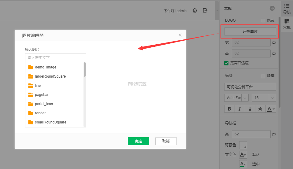 点击右侧常规Pane的Logo选择图片按钮,可以选择作为Logo展示的图片,默认为服务器bihome下的image文件夹中的图片,如图所示: