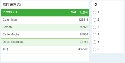 8. 在参数列表 ID 中选择任一选项实现对表组件的动态筛选,即按照“Sales_总和”字段的降序顺序进行筛选。