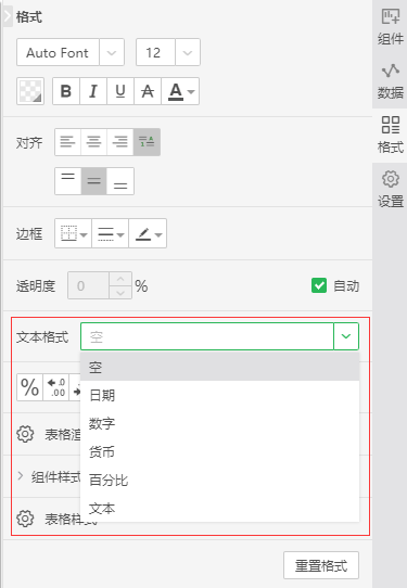 【数字】为数字类型的数据设置格式。 当选择数字时,下方会多显示一个数字格式下拉列表,此数字格式下拉列表既支持用户选择自带的格式,也支持用户自定义。
