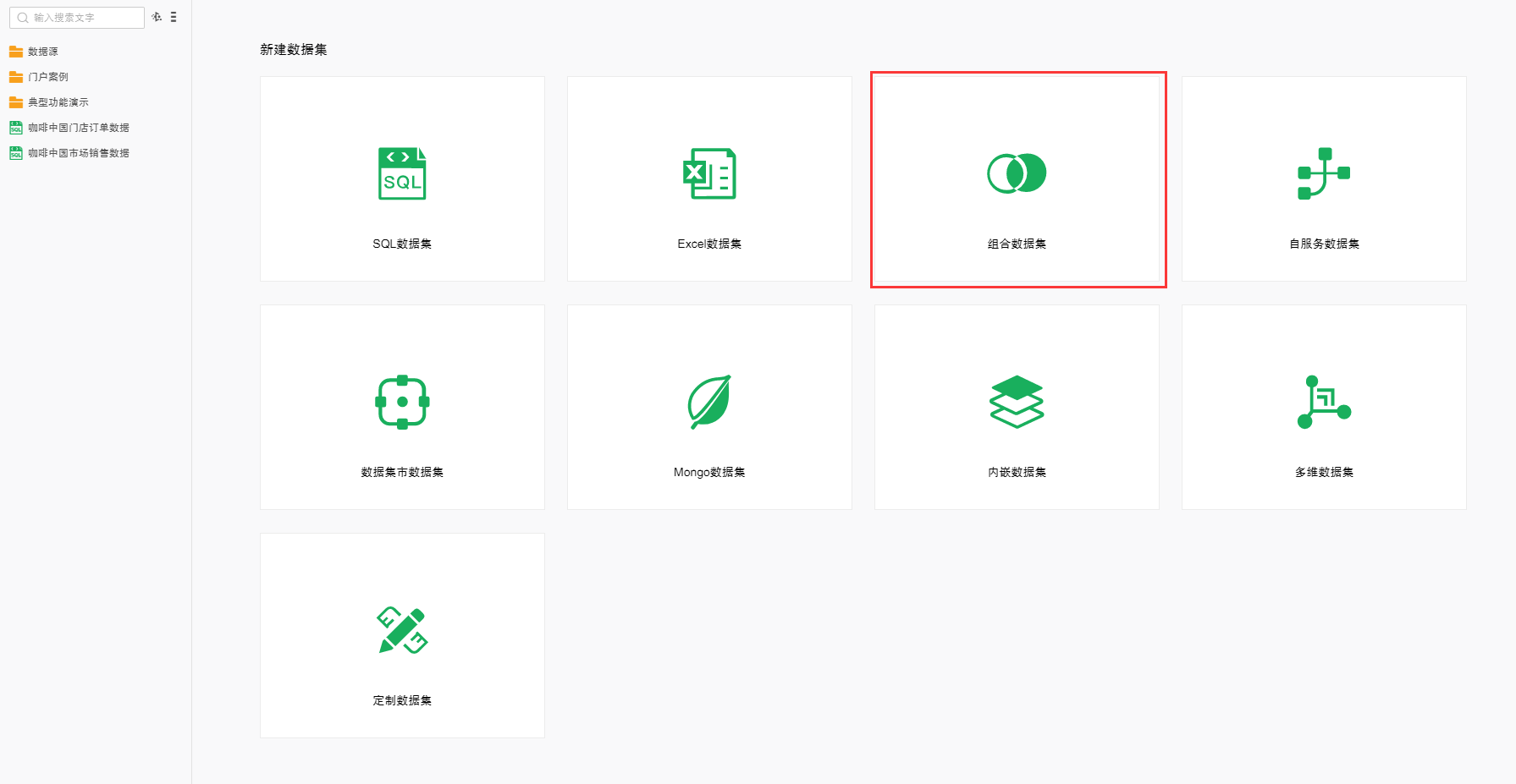 用户也在数据集模块中,点击菜单栏上的新建按钮,选择组合数据集,即可打开组合数据集界面。