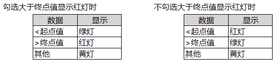 在表格渲染对话框中选择红绿灯渲染,支持显示值、起点值和终点值,大于终点值时显示红灯的勾选,并且支持红灯,黄灯,绿灯图片的自定义设置。脚本处于灰色状态,不支持脚本的输入。