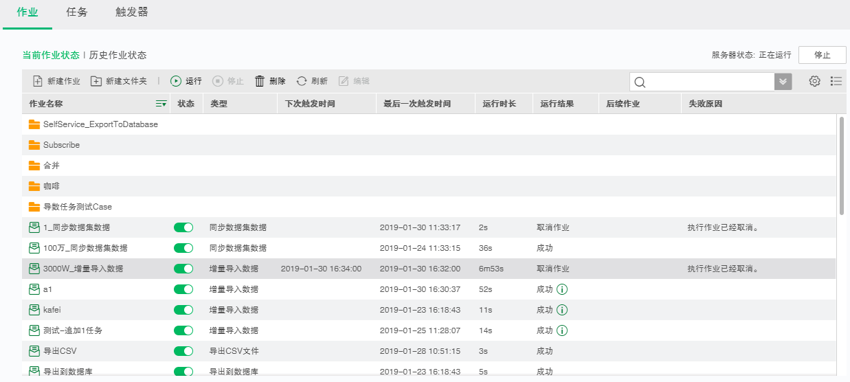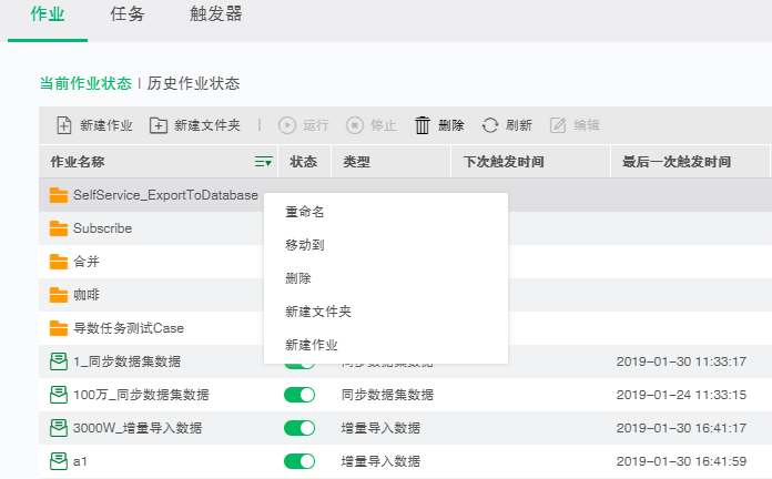 当前作业界面显示了所有创建的作业,用户可以使用文件夹对作业进行整理,如下图所示:
