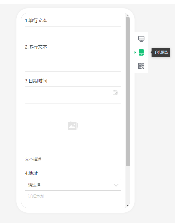 在制作表单的界面,点击右上角的“预览”按钮,可以查看表单在PC、手机的预览效果。