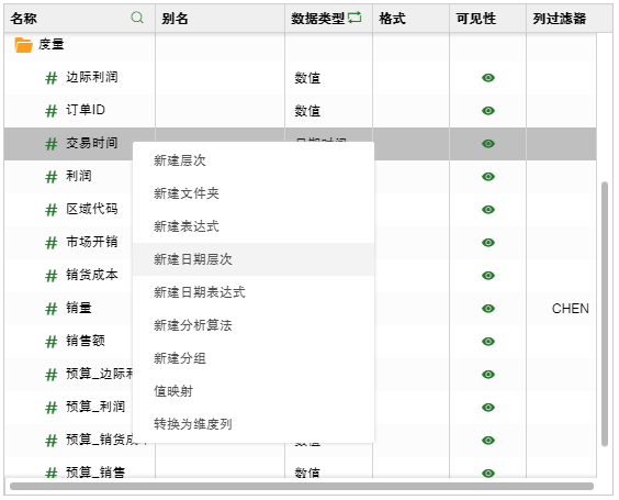 1)在元数据区域,在“更多”菜单中选择【新建日期层次】;
