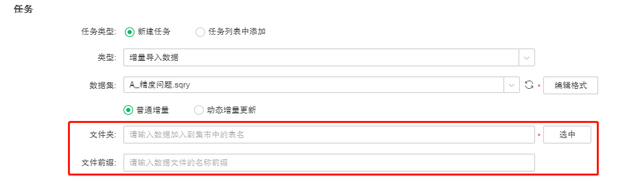 增量导入数据的方式分为“普通增量”和“动态增量更新”两种,默认为“普通增量”。“普通增量”是将数据集中的数据全量或追加导入到数据集市中;“动态增量更新”既能按配置时间更新数据集市中的历史数据,又能将数据集中新增的数据导入到数据集市中。
