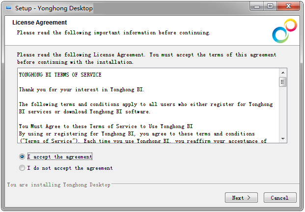 5. Select [I accept the agreement] and click the Next button to set the installation directory. Click the browser button to change the installation path. The default path is C:\Yonghong Desktop.