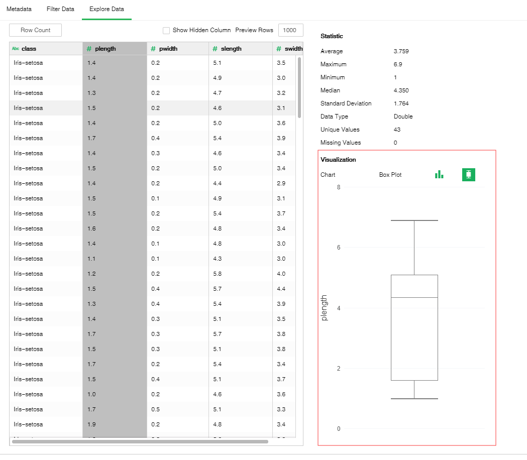 [Visualization] Visualization area displays the data analysis results of the selected columns via two types of charts: The histogram shows the data distribution of the selected columns; and box-and-whisker plot shows the data scope and exception data distribution of the selected columns. If the columns selected are non-data type, no chart will be drawn.