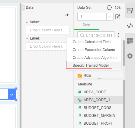 1.On the "Create Dashboard" page, select a data set to create a dashboard. Click the right mouse button and then choose "Apply Trained Model" from the context menu. Select the application training model by clicking the right button on the data set:
