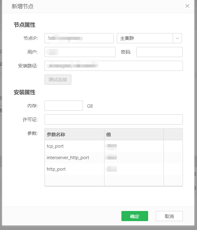 【测试连接】填写完节点ip,用户名,密码,安装路径之后,可以点击测试连接按钮测试是否可以成功连接服务器,如果填写信息正确,将显示测试成功。
