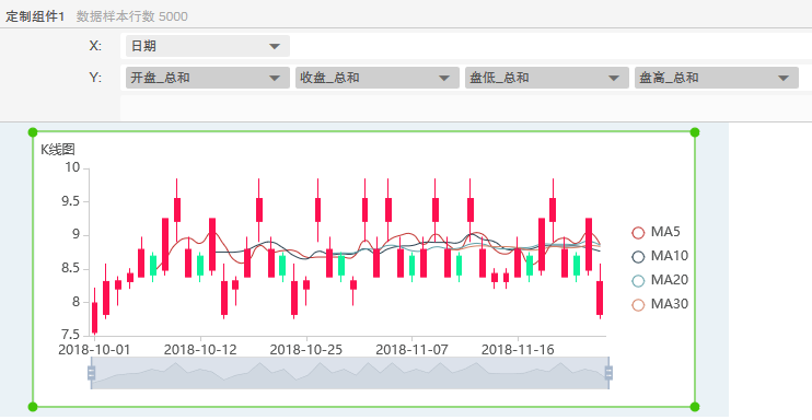 创建K线图,可以在右侧pane的组件中拖动K线图组件到报告编辑区域,按照绑定区域的提示绑定对应的数据,如下图所示,其中,MA5、MA10等分别表示5日和10日移动平均线。