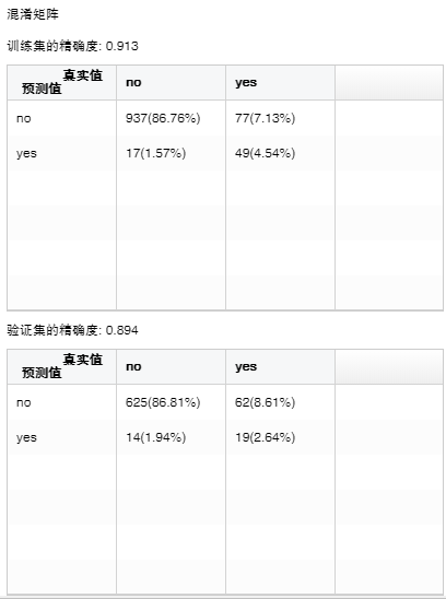 通过混淆矩阵可以看出训练集预测的精确度为91.3%,验证集的精确度为89.4%。