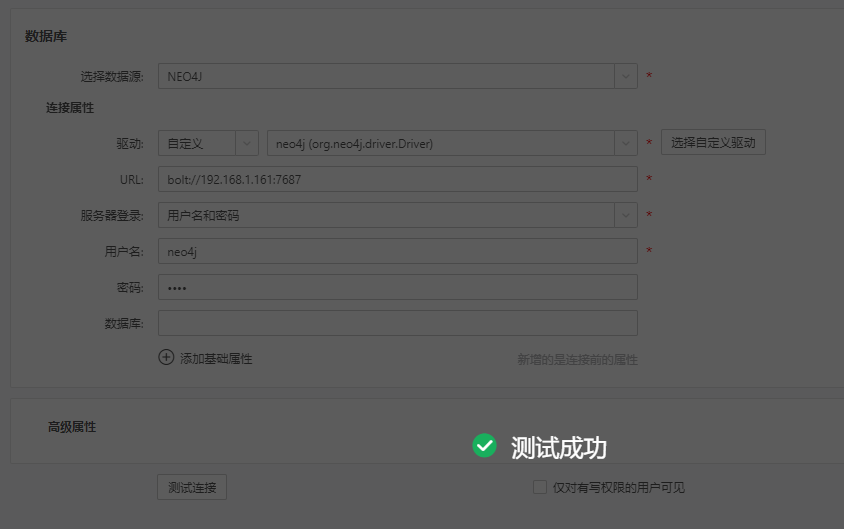 【URL】NEO4J 数据库的 URL 地址。在URL的项目中会直接将所填项目展示给用户,用户只需要修改正确的服务器地址就可以直接使用数据源。