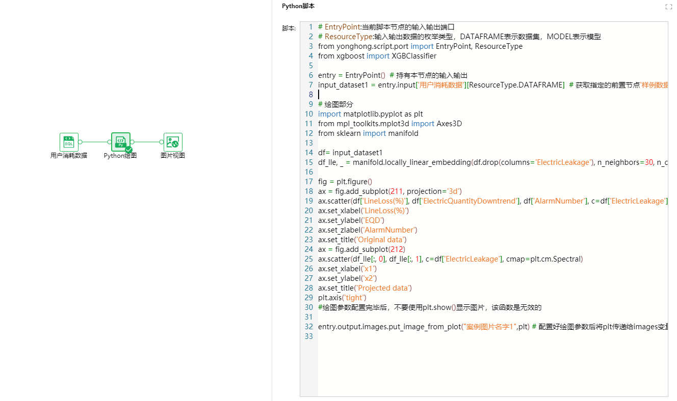 # EntryPoint:当前脚本节点的输入输出端口 # ResourceType:输入输出数据的枚举类型,DATAFRAME表示数据集,MODEL表示模型 from yonghong.script.port import EntryPoint, ResourceType entry = EntryPoint() # 持有本节点的输入输出 input_df = entry.input['样例数据集'][ResourceType.DATAFRAME] # 获取指定的前置节点'样例数据集'的输出数据 input_model = entry.input['决策树模型'][ResourceType.MODEL] # 获取指定的前置节点‘决策树模型’输出的训练模型 import pandas as pd entry.output.dataset = pd.DataFrame({'字段名':input_model.predict(input_df)}) # 将预测结果输出,如果有后置节点将被后置节点接收