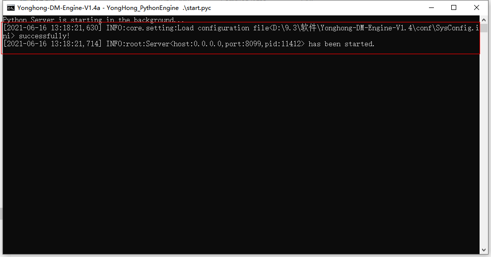 1.双击“\Yonghong-DM-Engine-V1.4\bin”目录下的“run.bat”文件启动Python服务器,如下图所示。