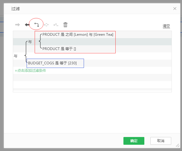 【删除】删除该行的上下两个过滤条件。即删除拥有此过滤关系的过滤条件。