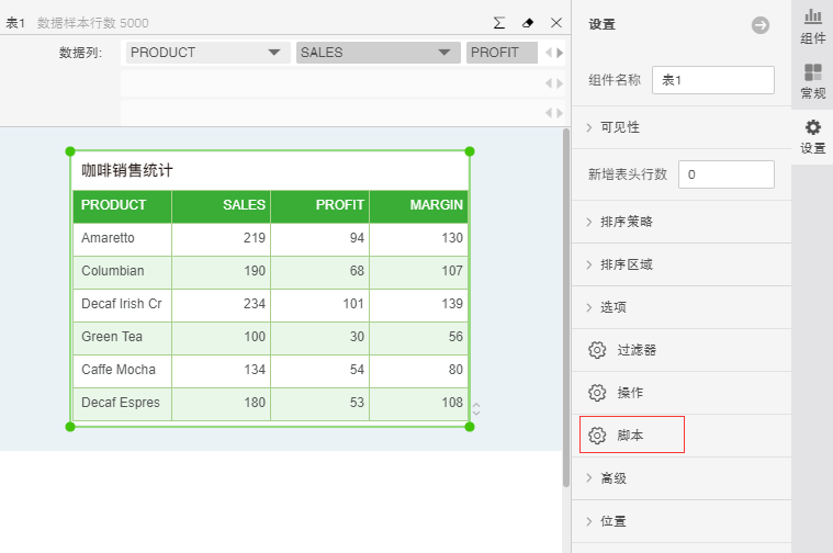 2. 打开表组件的脚本,打开脚本输入对话框,输入脚本: