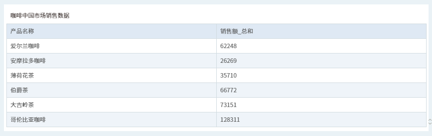 5.保存该仪表盘为“文本2”。在查看报告中,打开仪表盘“文本2”。当鼠标悬浮在摩卡咖啡上时,即可显示摩卡咖啡的相关信息,如下图所示。