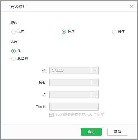 高级排序适用于聚合状态的表、交叉表以及处于聚合状态的图表。只有维度数据段才具有高级排序属性,度量类型的数据段不具有此属性。高级排序可实现对聚合的度量字段的排序。
