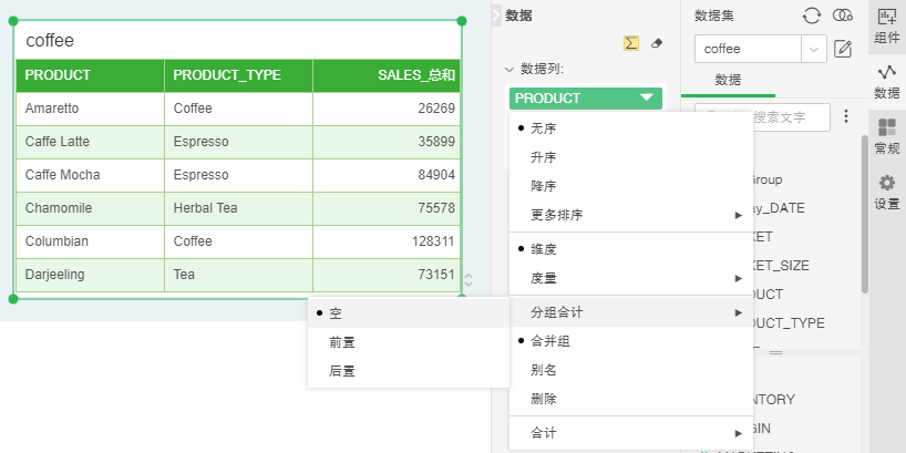 2.在维度数据段的下拉列表中选择合计,并选择前置或后置。