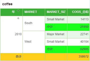 2.对第一个维度数据段设置合计后置,第二个维度数据段设置分组合计后置,如下图所示其中黄色区域显示的是合计结果,绿色显示的是分组合计结果。