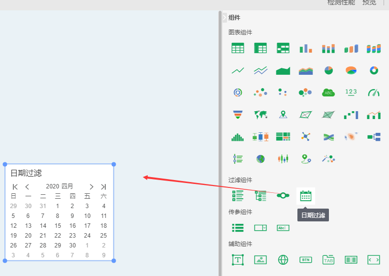 在右侧面板的组件中点日期过滤的按钮,按住鼠标左键将其拖拽到仪表盘编辑区,则在仪表盘编辑区中创建范围过滤。