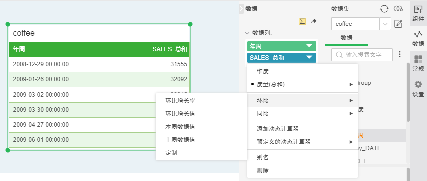 绑定维度列年周和度量列后 , 在绑定的度量列下面选择同比 , 显示的子菜单如下图所示 :