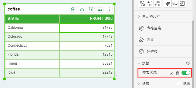 4.选中组件中有预警的区域,点击右侧面板-常规中的预警,可以展开并查看添加过的预警;在预警上可以直接点击开关来控制是否开启该预警,作用和预警设置中预警开关一致;鼠标悬停在预警上,出现预警的编辑、删除按钮,对应进行再编辑或者删除操作。