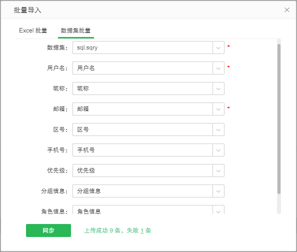 数据集批量导入:是将SQL数据集或Excel数据集中的用户批量上传至产品中。