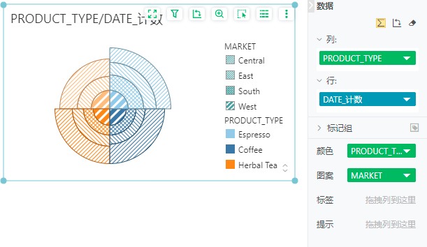 玫瑰图,也是一种圆形的柱图。可以在行/列轴上绑定度量列,也可以在行/列轴分别绑定维度和度量列,若有多个维度列,则最内层维度列会参与到绘图中,而不会出现在轴pane。玫瑰图绑定了维度列后,维度会按照度量默认降序排列。与饼图类似地,它显示一个数据系列中各项的大小与各项总和的比例,与饼图不同的是它的标记大小只影响某个扇形区域的半径,不会影响扇形对应的圆心角大小,是一种等角玫瑰图。玫瑰图同时也兼具堆积柱图的效果,可以对某个数据绘制的扇形区域根据标记组绑定的列进一步分组绘制。如下图: