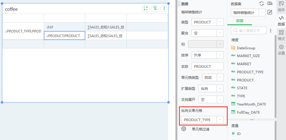 •存在自由表组件,包含纵向扩展的"PRODUCT_TYPE"和"PRODUCT","PRODUCT"的纵向父单元格为"PRODUCT_TYPE",组件元数据如图所示: