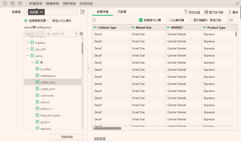 1)“刷新元数据”的功能优化为“刷新数据”。用户选择表或自定义SQL以后,可以点击“刷新数据”,来查看元数据、数据详情,进行数据处理。