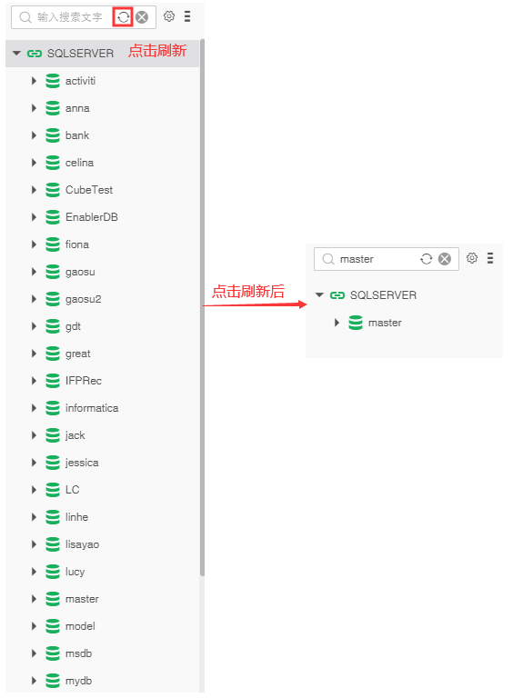 数据源搜索的用法以 SQLSERVER 数据库为例。点击搜索图标后,展开数据源,点击选择默认数据库master,点击刷新图标后,如下图所示。