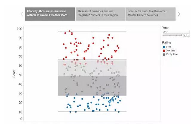 我们通过由Freedom House(一个独立的监测机构)整理的数据来探讨一下每一种分类。这些数据将每个国家按照“自由”,“部分自由”以及“不自由”进行排名。使用这个简单的数据组,我们可以讲出七个不同的故事。角度则取决于你想通过这些数据表现什么以及你将如何展现这些数据。